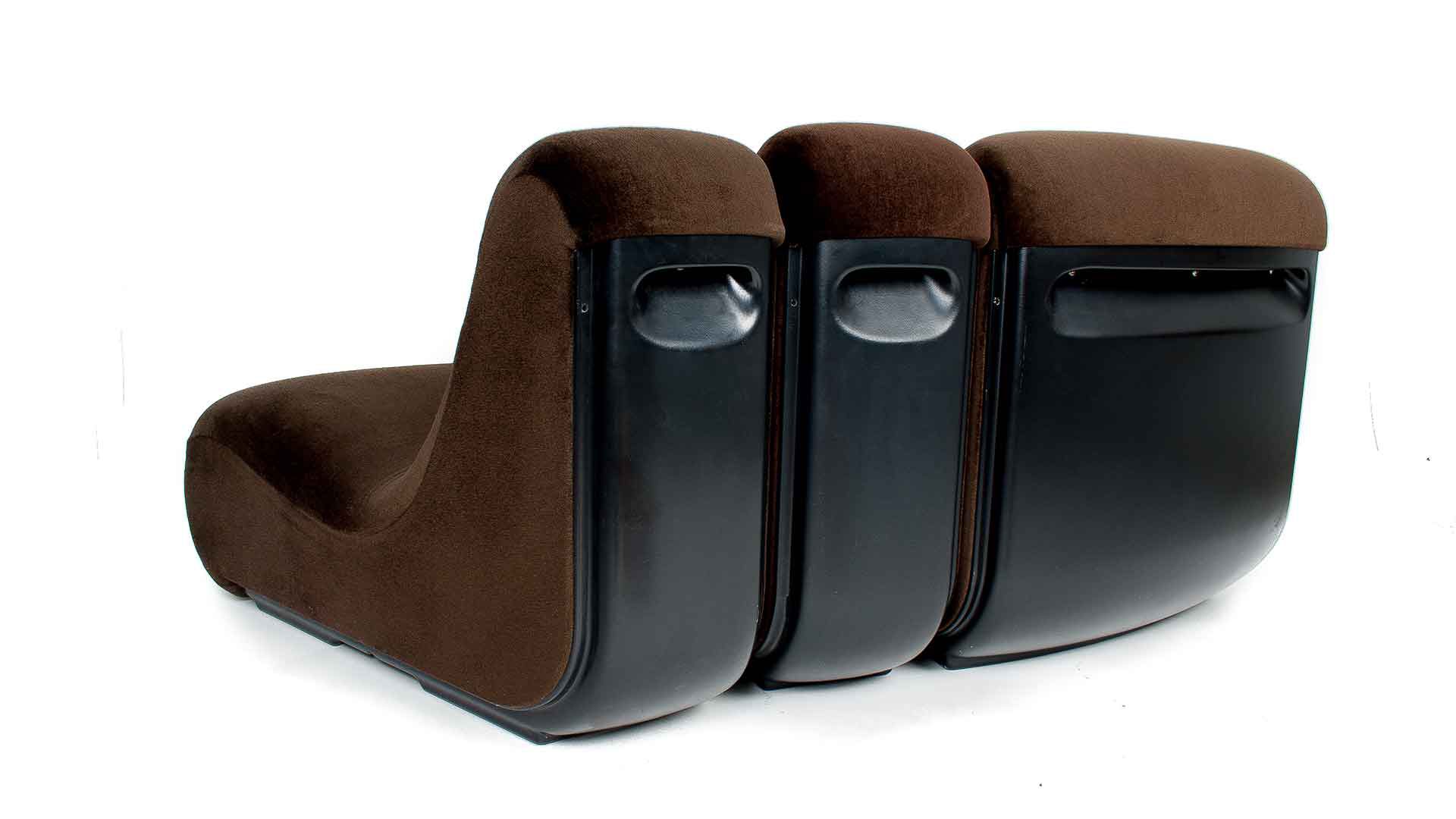This modular ‘Vario Pillo’ sofa set was designed by Burkhardt Vogtherr and manufactured by Rosenthal Studio Line in 1969. The 19 pieces are made from brown and purple velvet, sitting on a black and white fibreglass shells. There are 18 components, plus a stool and a rare tray. The shells of the elements are black and white color.